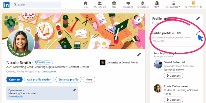• Custom URL: Create a custom LinkedIn URL to make it easy to share and look more polished.